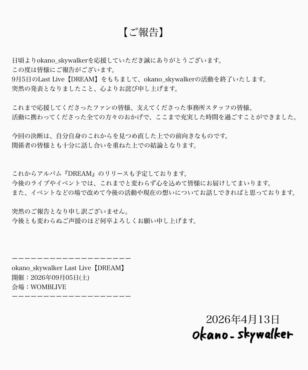 オフィシャルファンクラブは、okano_skywalker活動終了に伴い、